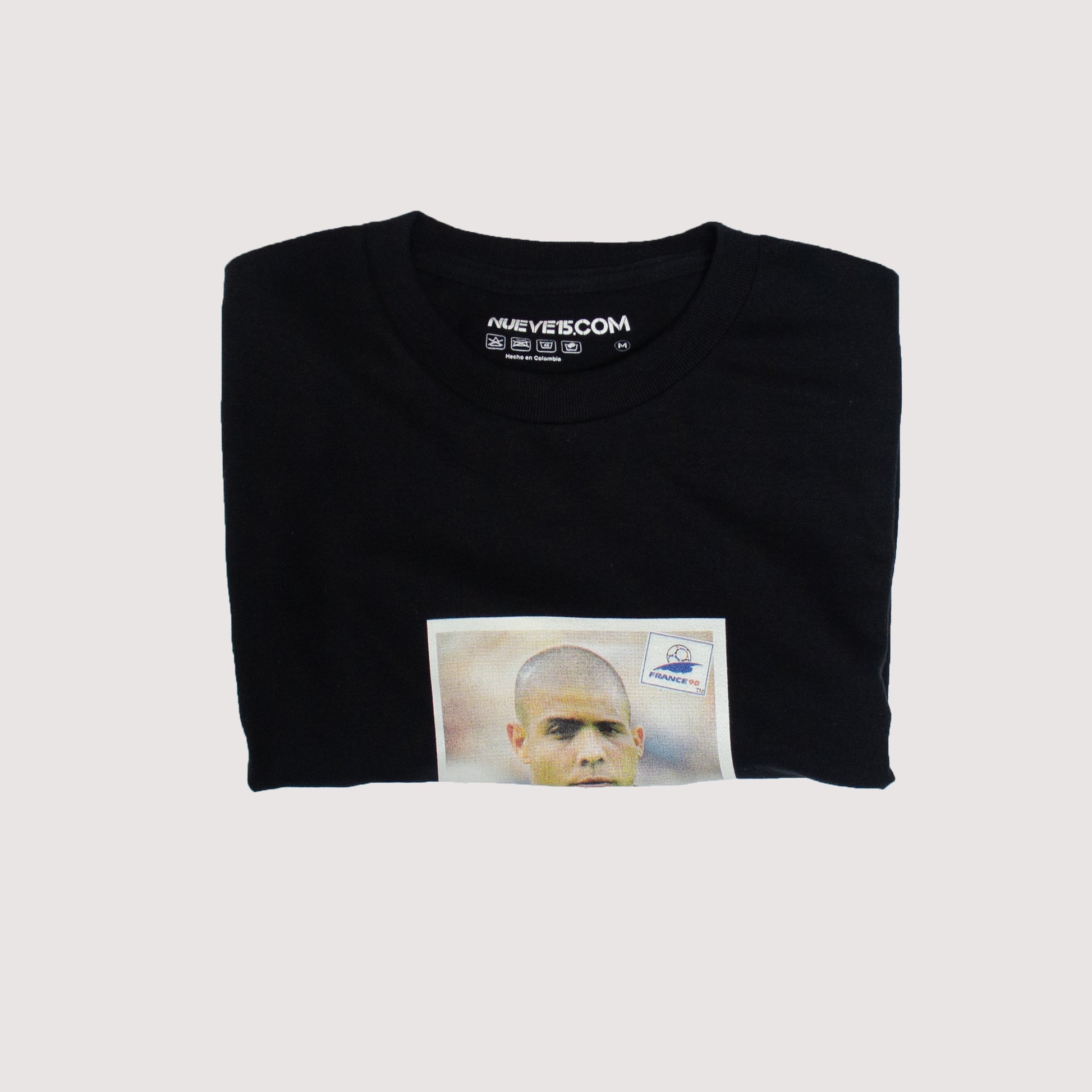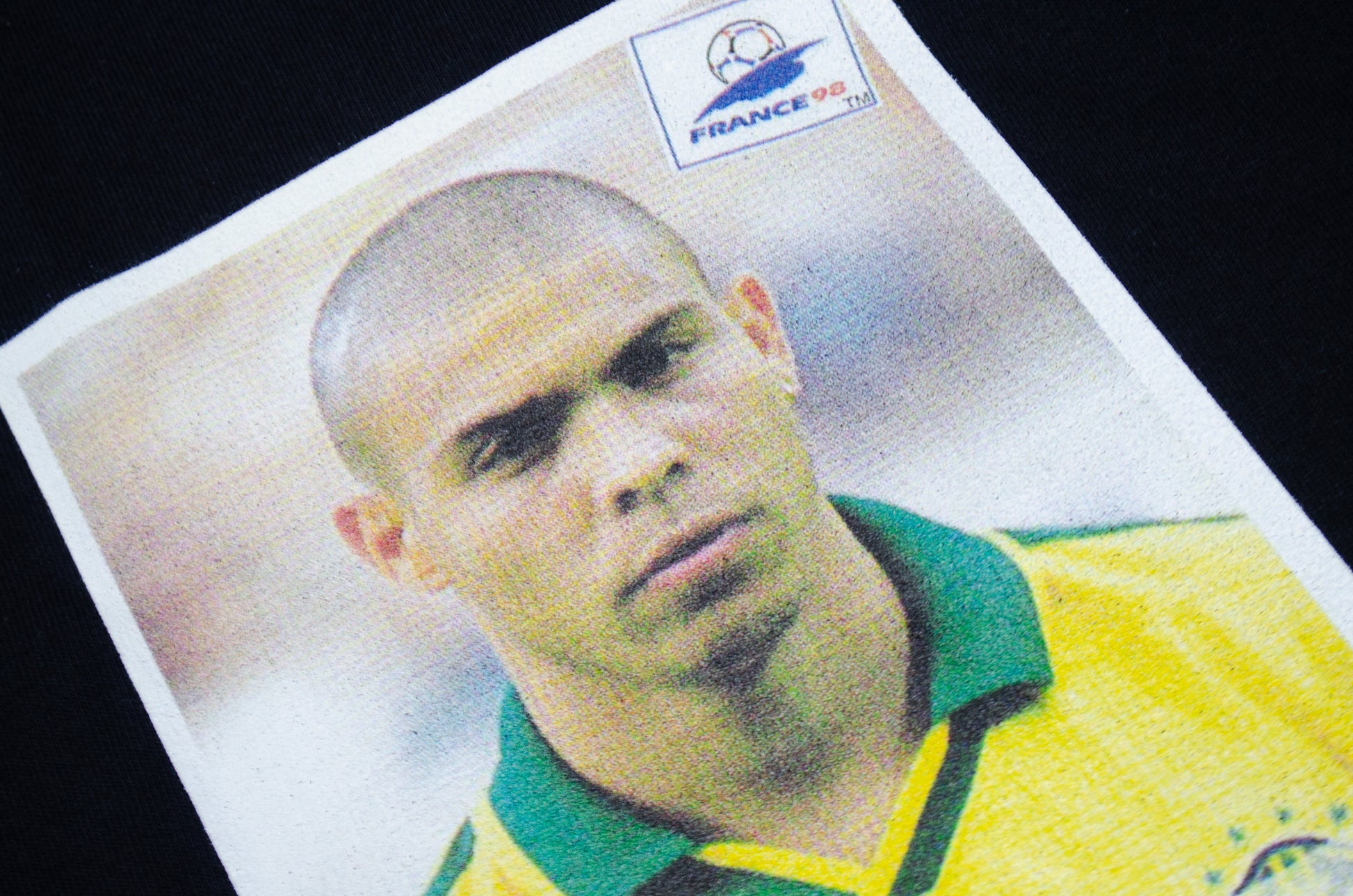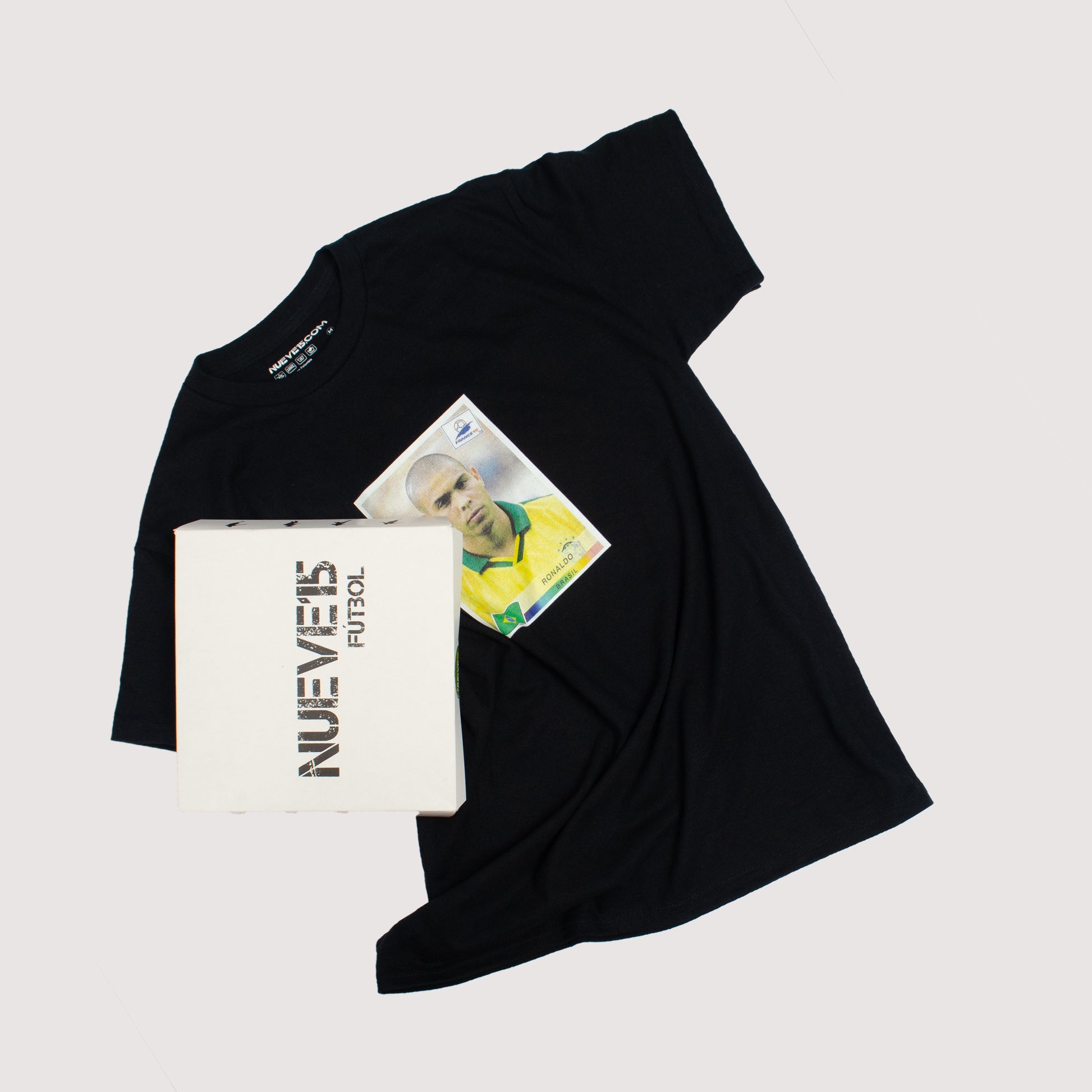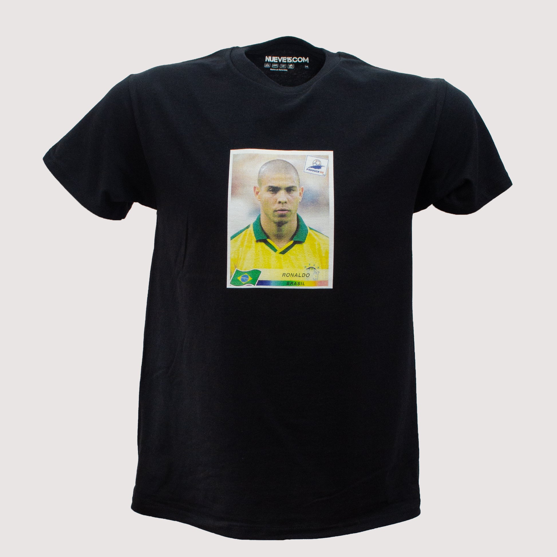 Camiseta inspirada en la lámina del álbum de Panini de Ronaldo Luís Nazário de Lima en el Mundial de Francia 1998. Para muchos, la mejor versión que tuvo este gran jugador brasileño.